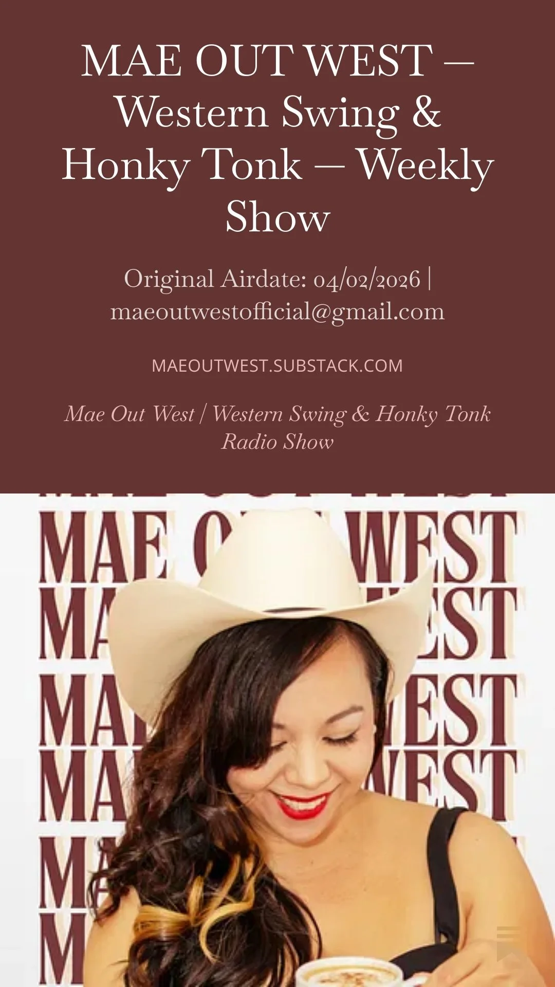 Weekly Radio ShowMae Out West is a weekly Western Swing and Honky Tonk radio + Podcast show based in Sacramento, California. Hosted by Meghan “Mae” McCoy, a Western Swing Hall of Fame inductee, the show features legacy artists and contemporary musicians carrying these sounds forward.